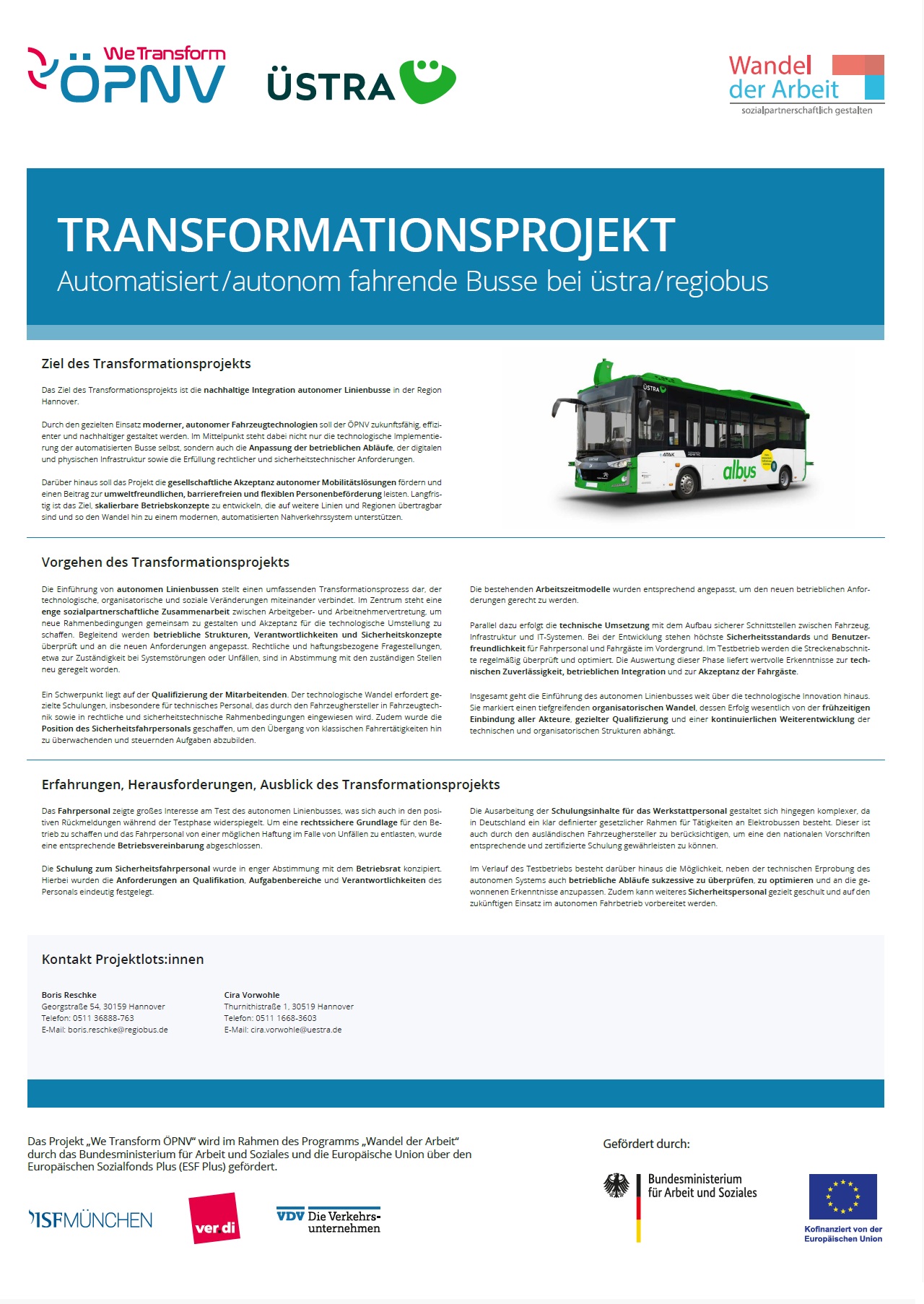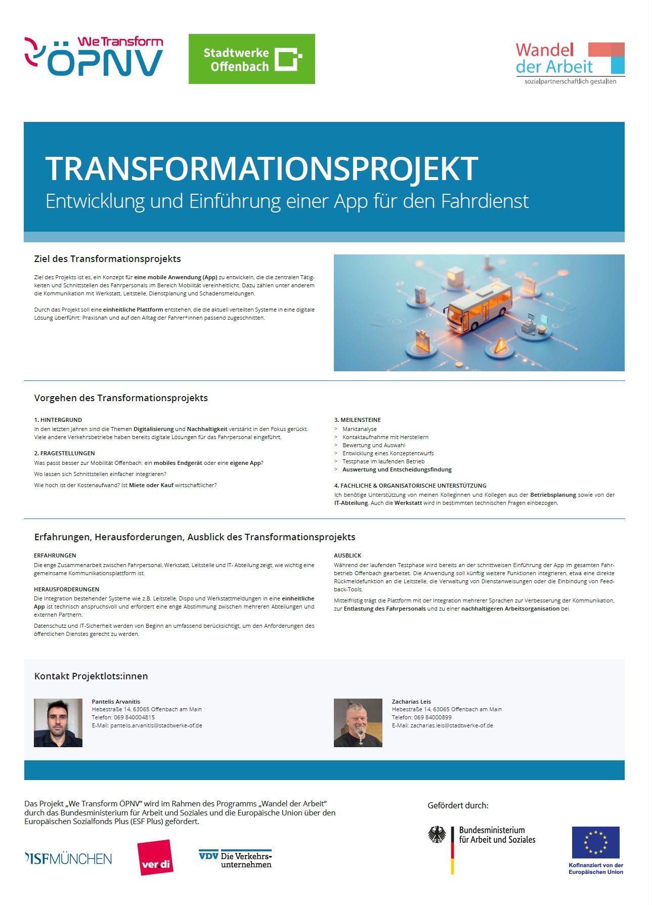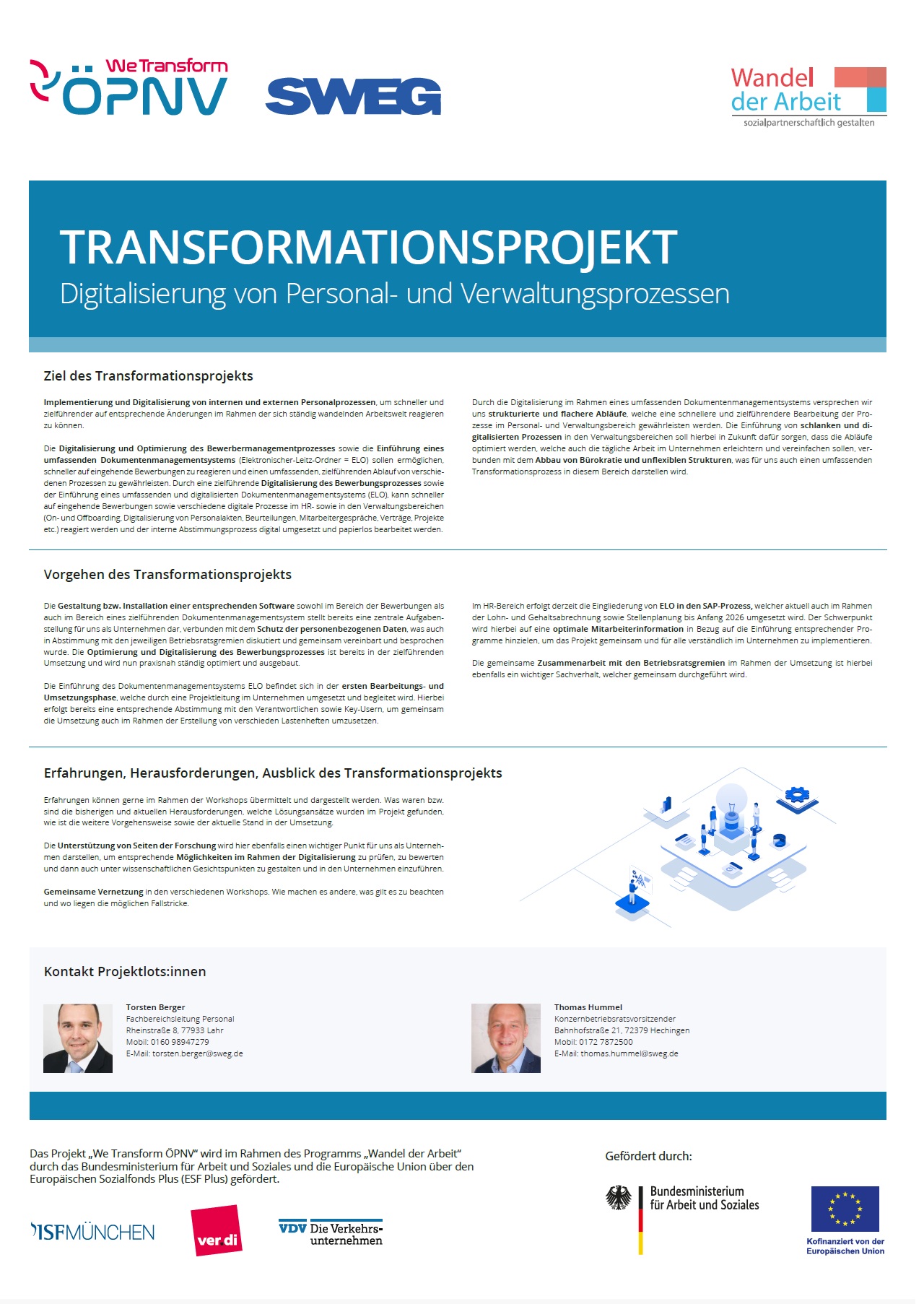 Das Projekt „We-Transform-ÖPNV“ wird im Rahmen des Programms „Den Wandel der Arbeit sozialpartnerschaftlich gestalten“ durch das Bundesministerium für Arbeit und Soziales und die Europäische Union über den Europäischen Sozialfonds Plus (ESF Plus) gefördert.
