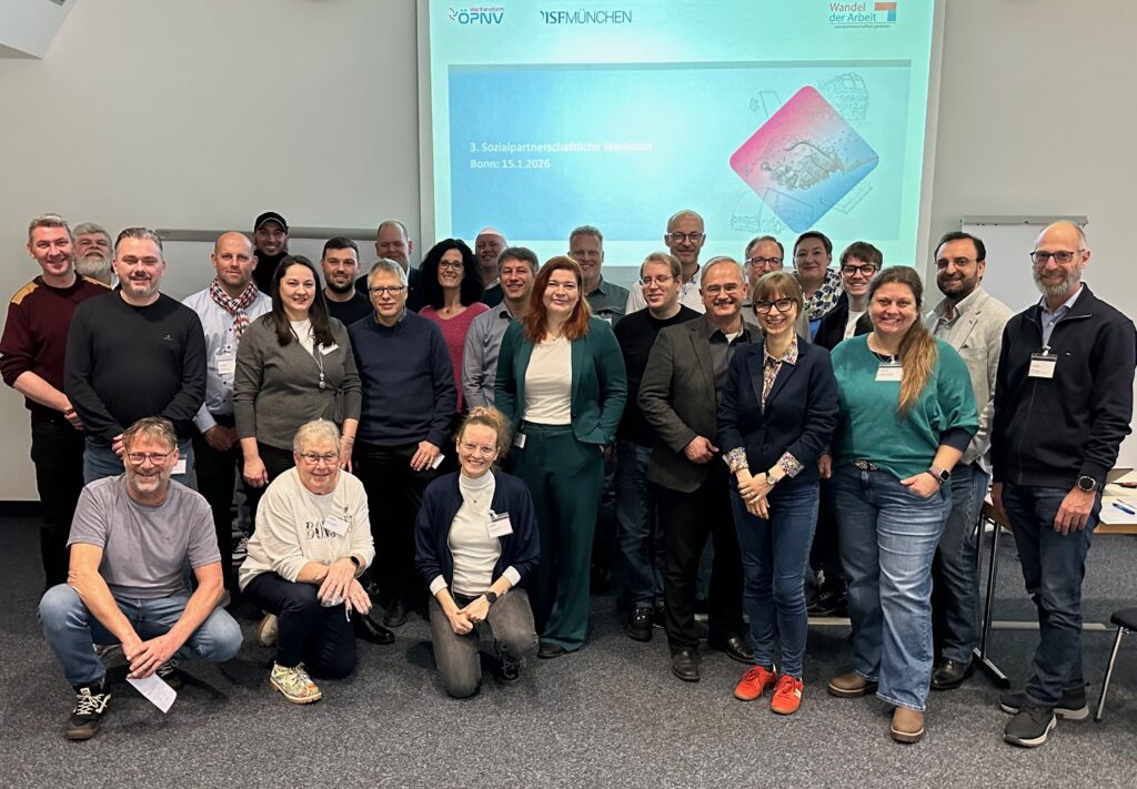 Im Zentrum der sozialpartnerschaftlichen Werkstatt am 15. Januar 2026 in Bonn stand die gemeinsame Auseinandersetzung mit aktuellen Transformationsprozessen der Stadtwerke Bonn (SWB) und der Würzburger Straßenbahn (WVV). Nach Grußworten von Anja Wenmakers (Geschäftsführung SWB) und Bernd Karl (Geschäftsführung WVV) sowie einer einführenden Phase des gegenseitigen Vernetzens und Vorstellens der am Werkstatt-Treffen beteiligten Personen wurden die beiden Betriebsfälle von den Projektlotsen aus SWB und WVV vorgestellt sowie in die vom ISF München im Vorfeld in den beiden Unternehmen durchgeführten Betriebsfallstudien eingeordnet.